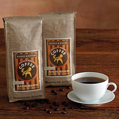 | Enjoy twice the flavor of your favorite whole bean coffee with this two-pack of peanut butter chocolate Moose Munch Coffee. Made from the finest Arabica beans grown on small coffee farms from around the globe, with rich flavors inspired by our caramel corn, chocolate and peanut butter, it's a delicious way to start the day. These beans are harvested by hand and roasted in the Pacific Northwest.