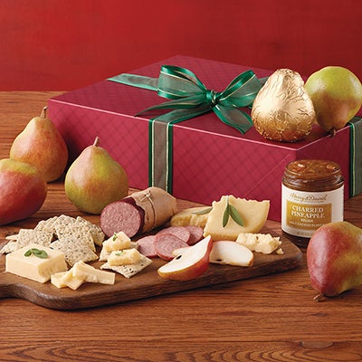 | Send delicious wishes in an artfully decorated box, topped with a hand-tied bow. Inside are extraordinary Royal Riviera Pears along with savory delights like hickory-smoked summer sausage, charred pineapple relish, and Gouda cheese. The flavors marry beautifully to create a delicious snacking spread. This delightful box makes a wonderful hostess gift.
