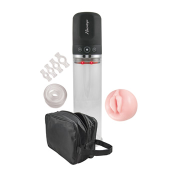 | "Color: Beige, Clear; Material: TPE; Powered By: Aaa-3; Special Features: Attachments, Penis ring included, Travel kit; Length: 7 3/4""; Cylinder diameter: 2 1/2""; Product Type: Penis pump; Manufacturer: Nasstoys"