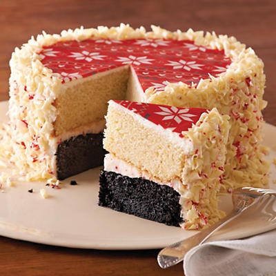 | Introducing our new Peppermint Bark Christmas Cake, developed in the Harry & David bakery as part of an exciting new collection of holiday cakes. Made with a layer of rich chocolate cake and a layer of fluffy white cake with peppermint buttercream frosting in between, this cake is then finished with buttercream frosting and decorated with exclusively designed artwork that celebrates the season. White chocolate curls and crushed peppermint decorations add a festive touch to a delicious cake that's perfect for sharing.