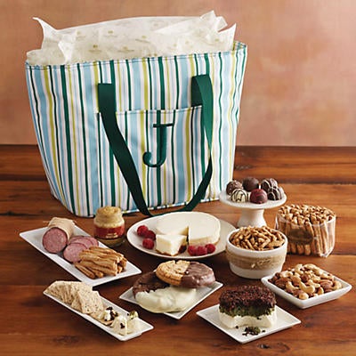 | Effortlessly create a delicious picnic. Lined and insulated, this striped tote bag can be personalized with an initial of your choice and arrives filled with a variety of sweet and savory snacks to take with you wherever you go. From cookies and truffles made in the Harry & David bakery and candy kitchen to a sun-dried tomato pesto torta to spread over crackers, there's something for everyone to enjoy.