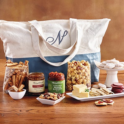 | Embark on a culinary adventure with this personalized gift tote filled with delicious gourmet snacks sure to satisfy. The dipped canvas getaway tote comes complete with a secure zipper to stow your favorite treats and can be personalized with your choice of initial. Now you can share a tasty assortment of fine food gifts when you pack the perfect picnic or give this Personalized Snack Tote Gift to a newly married couple. Its contents offer a wide array of sweet and savory flavors, including honey wheat pretzels, raspberry honey mustard dip, lemon shortbread cookies, hickory-smoked summer sausage, white cheddar cheese, and more.