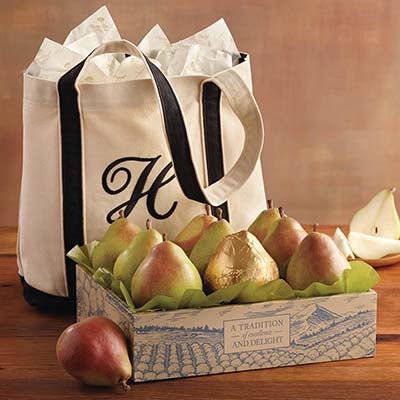 | Two gifts in one, this handsome canvas tote comes with a box of juicy, sweet Royal Riviera Pears ripened by the Oregon sun in our orchards. The buttery pears are great on their own for snacks, or paired with cheese and wine for entertaining. The tote will come in handy for trips to the market, and it can be personalized with a single initial, making the whole gift that much more special.