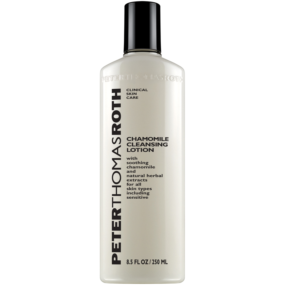 | Peter Thomas Roth Chamomile Cleansing Lotion is a non-drying cleanser that gently removes environmental pollutants, excess skin, oils and make-up. It leaves skin feeling silky, soft, and smooth. Excellent for all skin types, especially sensitive skin. Benefits: Beta Glucan nourishes the skin and prevents the skin from dehydration Coconut Acid provides a deep cleansing effect Chamomile Extract comforts and soothes [ 8.5 fl. oz. / 250 ml. ]