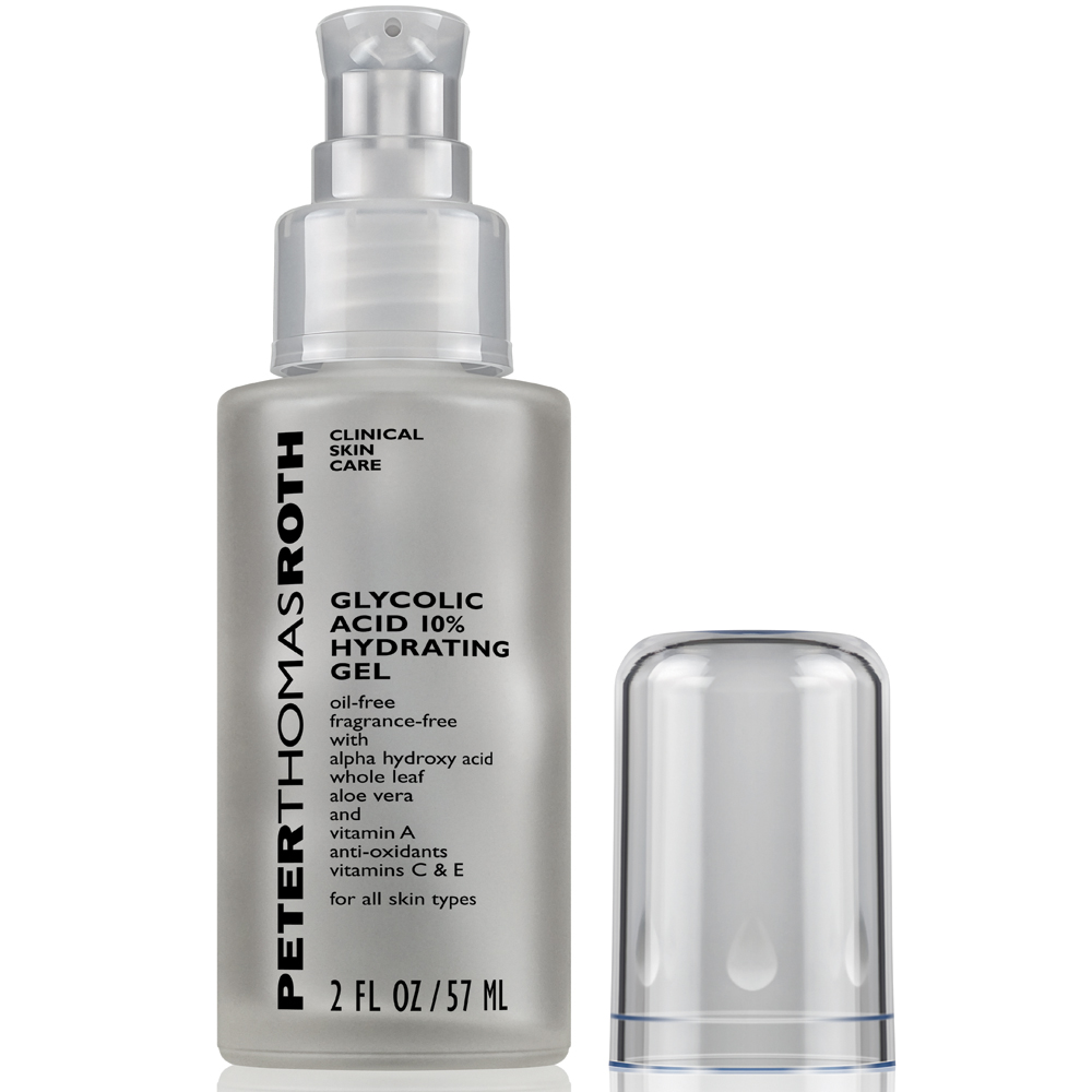 | Peter Thomas Roth Glycolic Acid 10% Hydrating Gel increases cell turn-over and helps diminish the appearance of fine lines and wrinkles. This lightweight gel supplies lost moisture, anti-oxidants, and glycolic acid to aging and sun-damaged skin. Benefits: Formulated with anti-oxidants, glycolic acid, and advanced cell renewal action to increase cell turn-over Helps reduce the appearance of fine lines, wrinkles, and other signs of aging Clarifies the skin and smoothes out rough texture [ 2 fl. oz. / 57 ml. ]