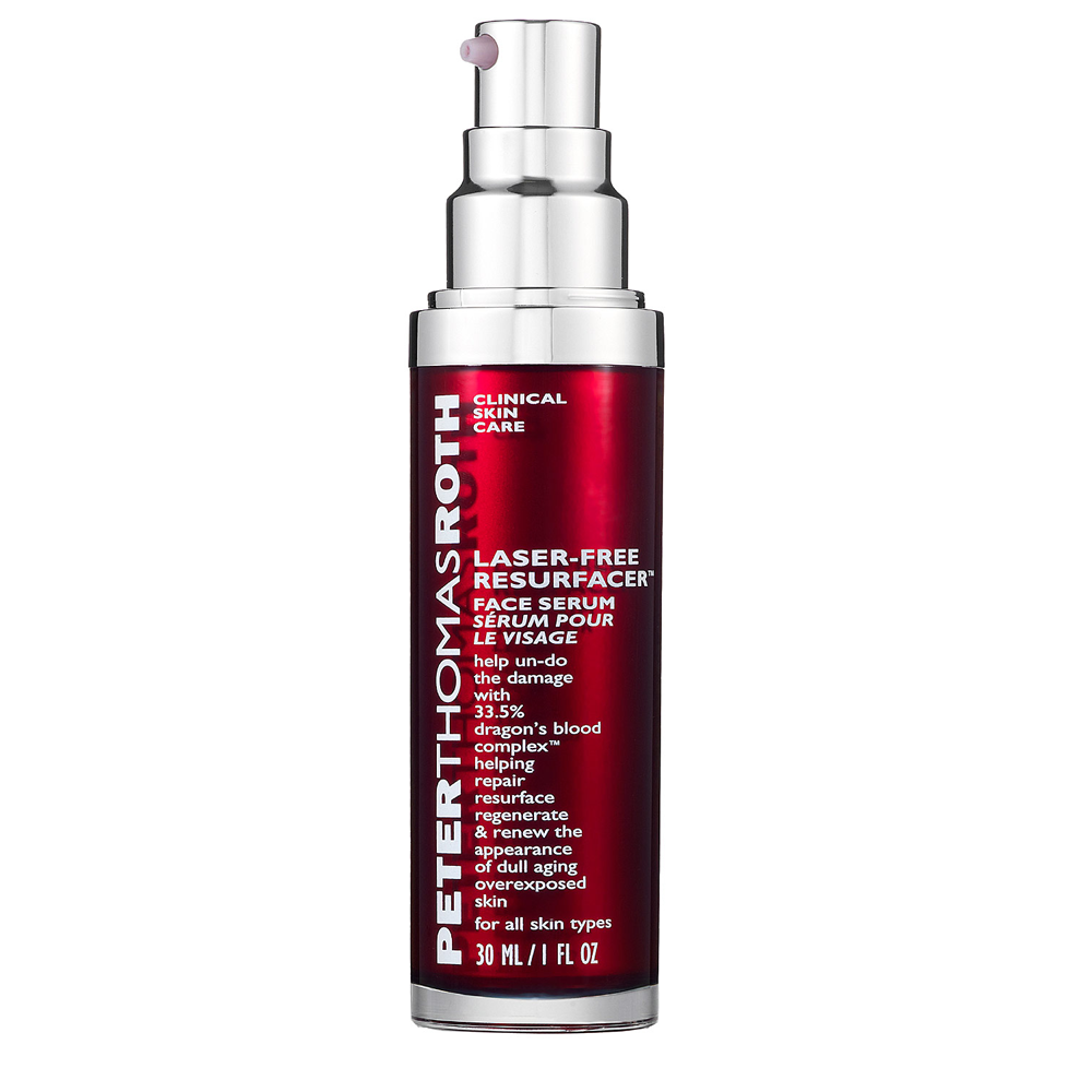 | Peter Thomas Roth Laser-Free Resurfacer with Dragon's Blood Complex noticeably decreases the appearance of aging caused by time, UV ray and environmental damage. This resurfacer helps to refine skin texture and tone, while leaving skin looking youthful, flawless, and clear. Benefits: Induced with Dragon's Blood at 5%, a red resin contracted from the Amazon's Croton Lechleri Tree, to help lessen inflammation and stimulate repair Treats and lessens the presence of any skin hyper-pigmentation, age spots, and redness Clinically proven to reduce the appearance of fine lines and wrinkles up to 80% Formulated without any sulfates, phthlates, or GMOs [ 1 fl. oz. / 30 ml. ]
