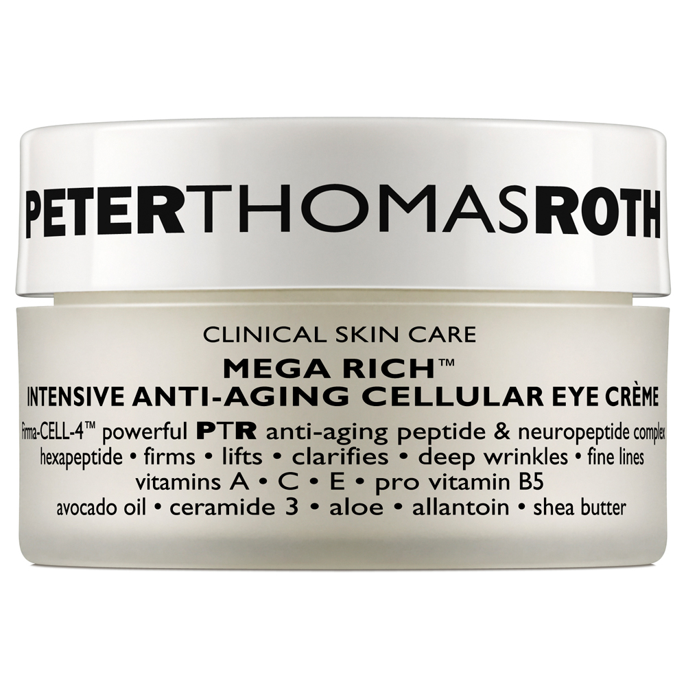 | Peter Thomas Roth Mega Rich Intensive Anti-Aging Cellular Eye Creme hydrates and combats signs of aging with wrinkle relaxing peptides that promotes tighter, firmer skin. Promotes collagen synthesis to tone, smooth, and lift skin, minimizing the appearance of fine lines and wrinkles. Benefits: Anti-aging peptides diminish deep wrinkles and fine lines Prevents the formation of lines and wrinkles by minimizing wrinkle-causing muscle contractions Mimics natural collagen production [ 0.76 oz. / 22 g. ]