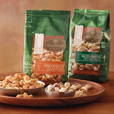 | Choose two bags from a selection of our most popular nut varieties. With savory favorites like giant cashews and roasted salted pistachios and sweet choices like honey roasted cashews, there's something for everyone to enjoy.