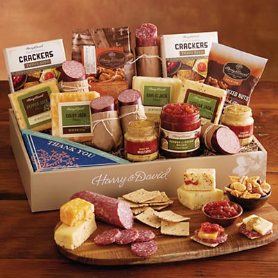 | For all of life's unique and momentous events, we've gathered a grand selection of our finest savory delights. Whether to celebrate a retirement, graduation, or everyday recognition, your recipient will delight in a message of thanks or congratulations tucked inside a banquet gift brimming with delectable treats.This product contains: garlic jack cheese, Colby Jack cheese, pepper jack cheese, Sicilian Jack cheese, pepper and onion relish, honey hot mustard, hickory-smoked summer sausage, Thuringer sausage, three-seed crackers, cheddar snack mix, Milano Italia dry salami, and mixed nuts.