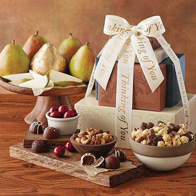 | If you're looking for a way to show your appreciation or celebrate an event for someone special, our Pick Your Occasion Gift Tower is an elegant choice. This gift comes replete with our juiciest pears and sweetest treats, including our decadent chocolate truffles and Moose Munch Gourmet Popcorn and arrives wrapped in a beautiful hand-tied ribbon bearing your choice of message.This product contains: Royal Verano Pears, Moose Munch Milk Chocolate Premium Popcorn, mixed nuts, and signature truffles.