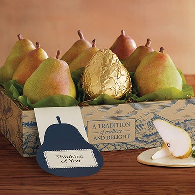 | Fresh fruit always makes a wonderful gift, no matter the occasion, and our handpicked Royal Riviera Pears are the apex of gourmet fruit. Celebrate any occasion by sending a gift box filled with our large pears and one of four commemorative placards: Happy Birthday, Thinking of You, Thank You, and Congratulations.