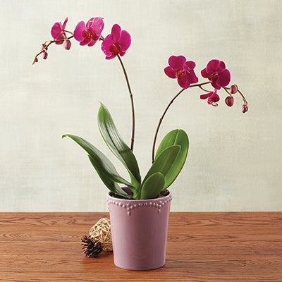 | The statuesque phalaenopsis orchid is a delightful display of flowering confidence, reaching up to 28 inches in height. This one is especially stunning with two stems of brilliant purple blooms. Regal yet quietly elegant, this decorative flower will liven any room, and given proper care, it can bloom for years to come.