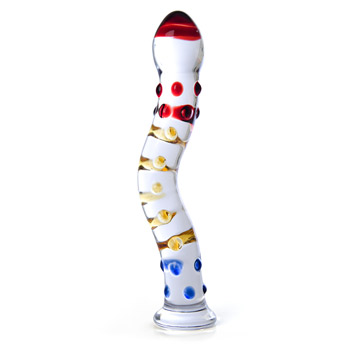 | "Color: Multi-color; Material: Borosilicate glass; Special Features: Bleachable, Boilable, Contoured, Dishwasher safe, Flared base; Length: 7 3/4""; Circumference: 4 1/4""; Weight: 10.5 oz; Insertable length: 7 1/4""; Diameter: 1 3/8""; Product Type: Glass G-spot dildo; Manufacturer: Eden Toys"